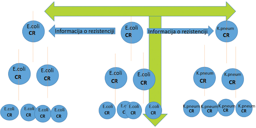 Bakterije imaju sposobnost da kopije plazmida koji mogu da nose, između ostalog, i gene za rezistenciju, podijele svojim “komšinicama”. One ih isporučuju susjednim bakterijama koje čak ne moraju biti ni istog roda, a mogu biti i vrlo genetski udaljene bakterije. Na ovaj način se informacija o rezistenciji širi horizontalno (Slika 2). Međutim, istovremeno, kada se bakterije dijele, one kopiju plazmida predaju i ćelijama kćerkama, pa na taj način informacija o rezistenciji se širi vertikalno. Zato se može reći da su plazmidi bakterijski internet.