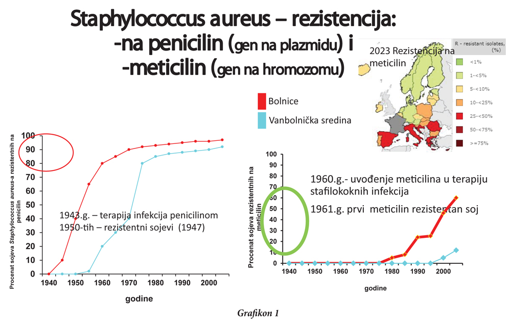 Logično da su se prvi sojevi Staphylococcus aureus-a rezistentnih na penicilin pojavili u bolnicama, zato što su bolnice mjesta gdje su u kontinuitetu prisutni antibiotici, koji se daju bilo terapijski, bilo profilaktički. Nakon 10-tak godina rezistencija na penicilin počela je da se javlja i u vanbolničkoj sredini. Grafikon pokazuje kako je geometrijskom progresijom stopa rezistencije na penicilin porasla za kratak period vremena i već 60-tih penicilin je postao neupotrebljiv za liječenje stafilokoknih infekcija (grafikon 1). Danas je stopa rezistencije stafilokoka na penicilin između 80 i 100%, globalno.